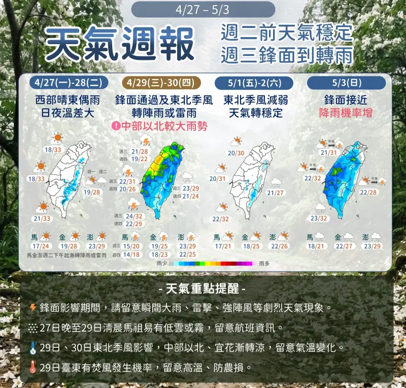 中央氣象署未來一周天氣,台灣呈現「先穩定、後轉雨、再回暖」的節奏,周二(4月28日)前各地天氣溫暖穩定,周三(4月29日)鋒面通過、東北季風增強,全台轉為濕涼型態,氣溫明顯下降;勞動節連假前期(5月1日至5月2日)短暫回穩,周日(5月3日)另一波鋒面接近,降雨機率再度提高。