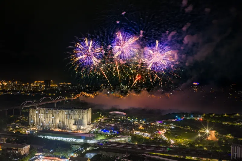 晚間登場的煙火與無人機展演大秀「光有回聲」,依循音樂節奏精密編排,打造「天空雙舞台」的立體展演形式。超過2,500發的煙火,透過高、中、低空層次配置,以五色瀑布型與落葉型花色為主軸,呈現流動且富層次的視覺效果;無人機編排出美術館外觀、金牛角及三鶯線列車等動態圖像,透過光影交織,呈現具有情感深度與象徵意義的夜空藝術饗宴。