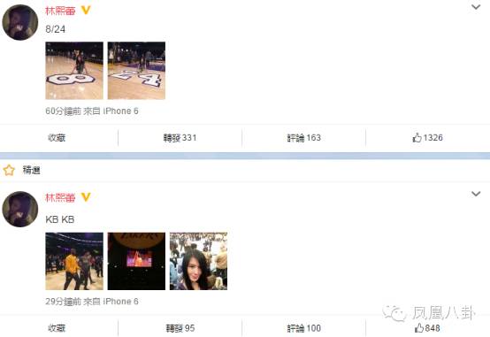 林熙蕾則堪稱是華人娛樂圈的Kobe頭號女粉絲,常常在微博上呼喚Kobe,前10條熱門內容有一半和Kobe相關的: