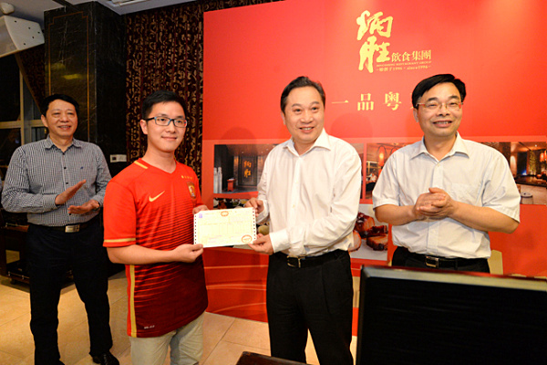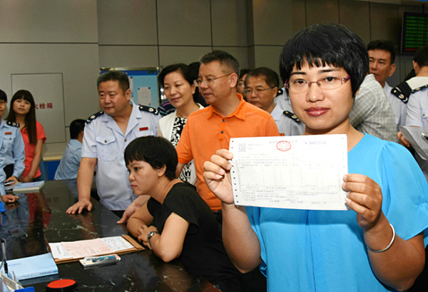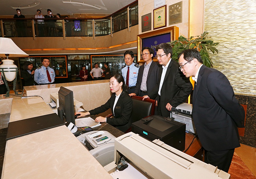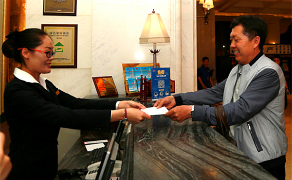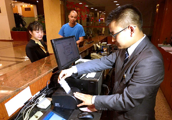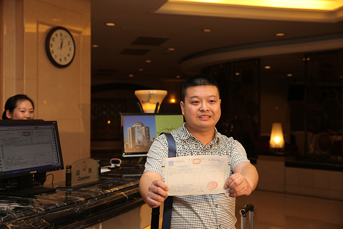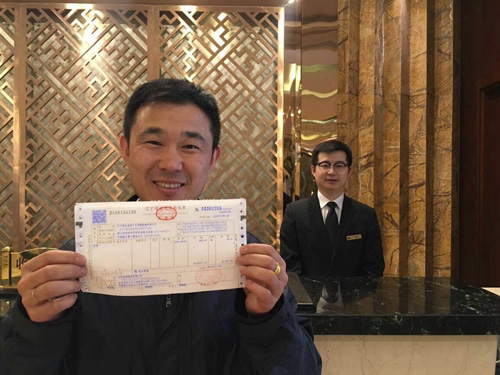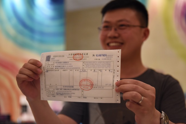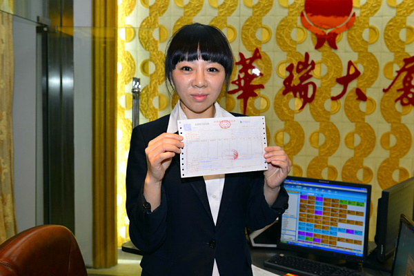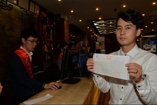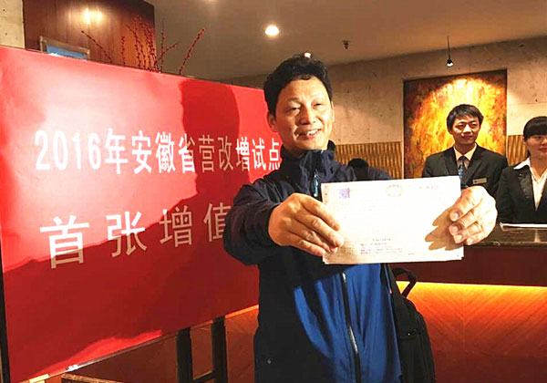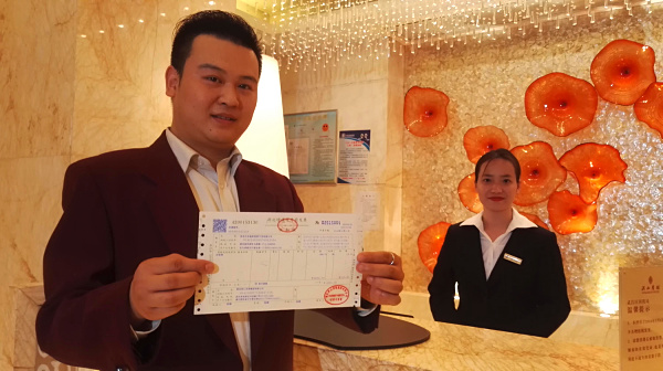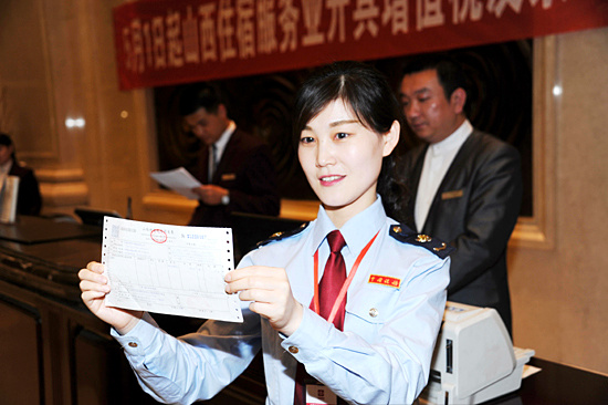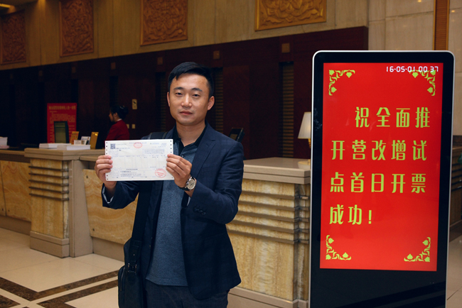 【福建】5月1日,住客謝平在展示由福州大飯店開出的營改增試點全面推開後福建省首張增值稅發票。