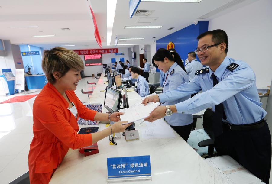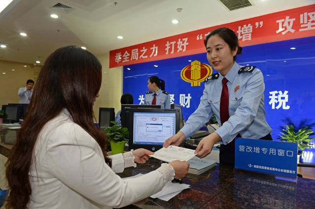 【廣西】5月1日,在廣西柳州市融安縣國稅局辦稅大廳,工作人員為納稅人辦理增值稅普通發票領用業務。當日,營業稅改徵增值稅改革在大陸全國推開。
