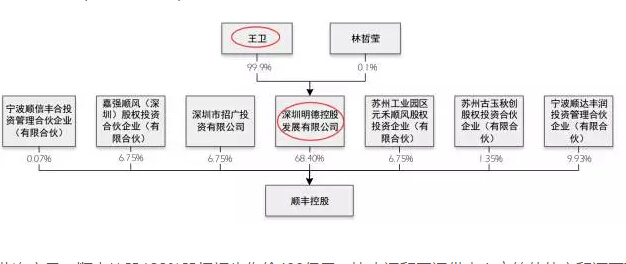 據A股上市公司鼎泰新材(002352,SZ)5月23日發布的公告,順豐控股將借它的殼上市。在交易完成後,明德控股將成為上市公司控股股東,王衛將成為實際控制人。順豐控股的股權結構如下圖示: