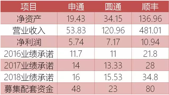 需要注意的是,順豐控股淨資產為137.95億元,433億的估值相當於溢價超過2倍。為此,順豐控股的股東們承諾:2016~2018年,順豐控股扣非淨利潤分別不低於21.8億元、28億元和34.8億元,否則將以約定方式補償。
