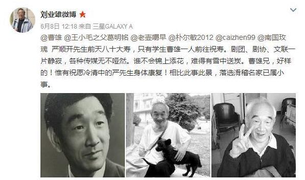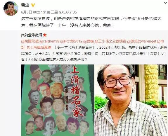 近日,上海人民滑稽劇團滑稽演員曹雄在微博爆料:今(2016)年6月6日是嚴順開80大壽,我在醫院待了一上午,沒有人來關心他,悲哀!微博發出後,引來網友的關注,大家除了送上生日祝福外,也對老人家的近況表示關心。