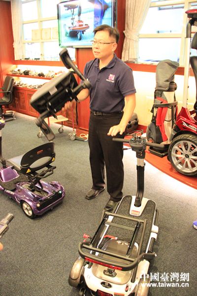 圖為台灣維順工業股份有限公司董事長特別助理謝東霖展示該公司生產的電動代步車。