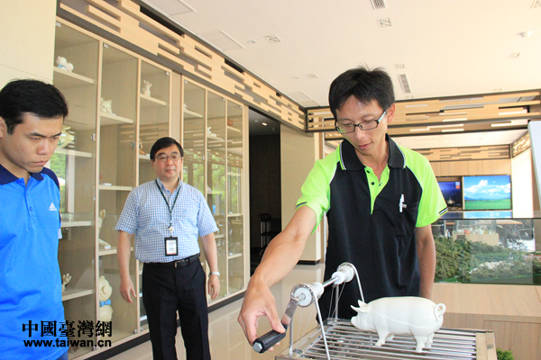 圖為台灣大成集團設立在屏東縣新埤鄉箕湖村的豬種養殖基地內,工作人員演示豬糞便處理裝置。