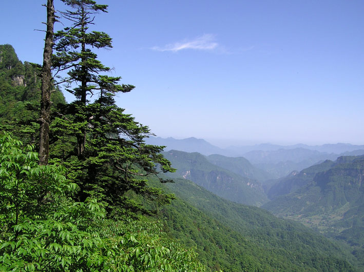 從埡底至近頂,條梁聳翠,澗谷含幽,小徑迴旋,山花遍綴,蔥蘢樹木間以青藤纏繞,潺潺泉聲伴以唧唧鳥鳴。尤其是突橫之飛壁,乍陳之危崖,密擠一片,宛若綠色絨縵,迎風搖曳,令人賞心悅目,只覺妙趣橫生。登臨崖頂環顧四周,只見千峰競峭,萬嶂爭拔,龍騰蛟升,直衝凌霄;高低森林,起伏碧連,若滄海巨濤,滾湧天際。斷壁間,百丈瀑布好似銀絲飄垂;稍遠處,浩瀚長江恍若長帶飄動。山巒、密林、流水時而滴蒼飛翠;時而融金耀彩;時而裹霧籠煙;時而披紗纏雲;真乃景象萬千。