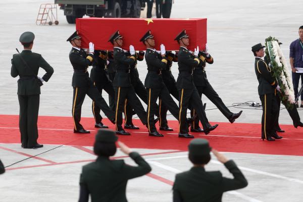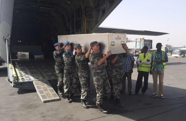 馬里當地時間6月6日,搭載申亮亮遺體靈柩的聯合國專機,從加奧飛抵首都巴馬科。大陸駐馬里維和部隊4名士兵為英雄扶靈。