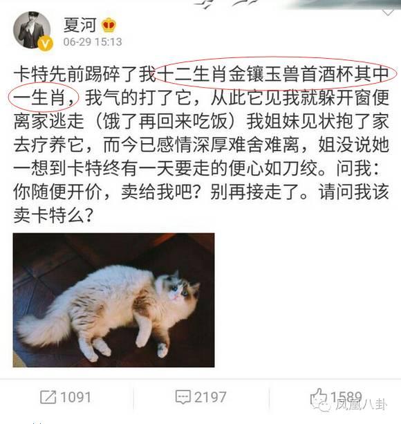 根據鳳凰八卦微信公眾號報導,起因是這樣的,夏河家的一隻布偶貓踢碎了他家一個擺飾,號稱是12生肖金鑲玉獸首酒杯,夏河一怒之下打了貓一頓。