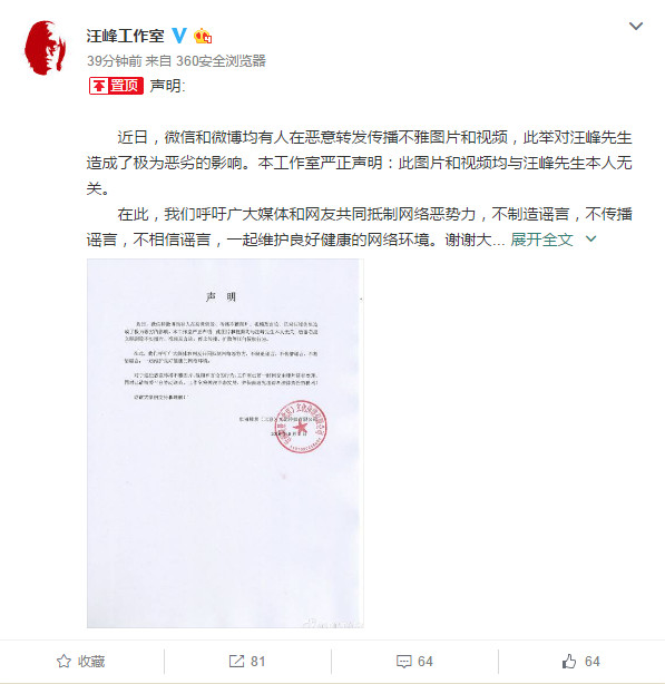 近日,微信和微博均有人在惡意轉發傳播不雅圖片和影片,此舉對汪峰先生造成了極為惡劣的影響。本工作室嚴正聲明:此圖片和影片均與汪峰先生本人無關。在此,我們呼籲廣大媒體和網友共同抵制網路惡勢力,不製造謠言,不傳播謠言,不相信謠言,一起維護良好健康的網路環境。謝謝大家的支持和理解。