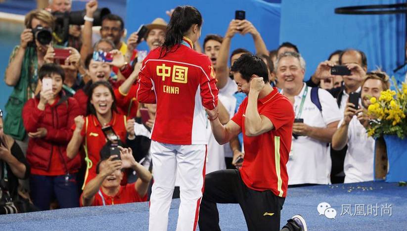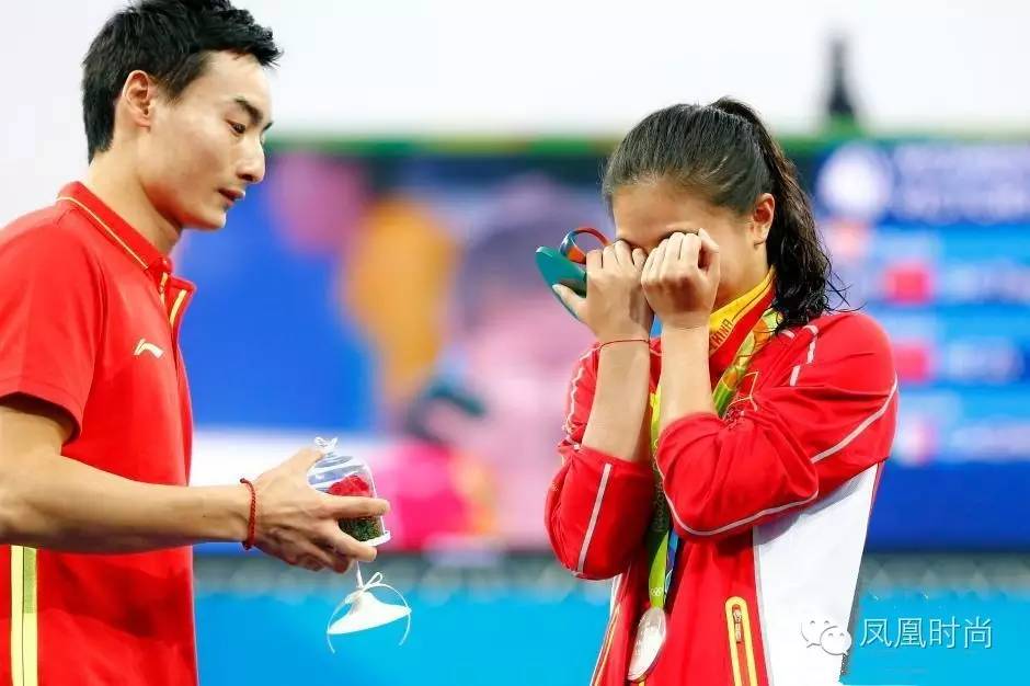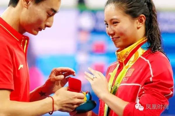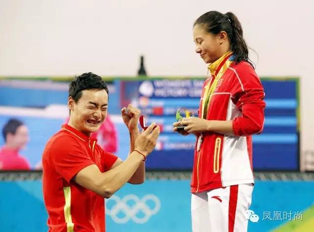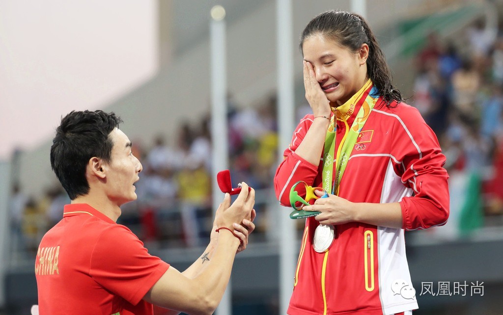 根據鳳凰時尚報導,在跳水女子單人3公尺板的頒獎時,秦凱從場邊慢慢走到了頒獎台邊,一記單膝跪地姿勢後,他打開了裝著戒指的紅色盒子向女友何姿求婚!何姿頓時被這意外的驚喜感動得淚流滿面,此刻,這對跳水情侶在里約奧運場上結束了6年的愛情長跑,讓全世界見證了一次他們的幸福~