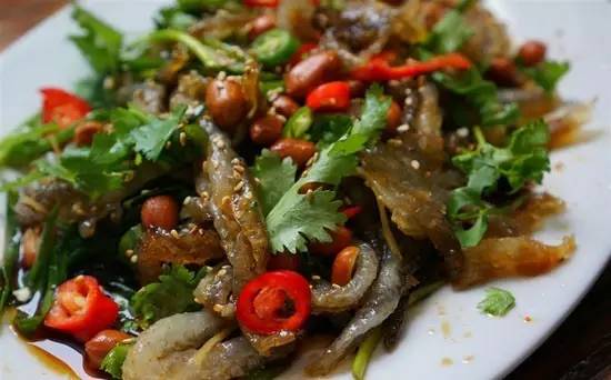 陳添記的涼拌鯪魚皮在廣州十分有名,這家店將魚皮做的十分爽口,毫無腥味。再加上花生、芫茜以及上澆的醬油芝麻,味道一流,是廣州的一大特色美味。