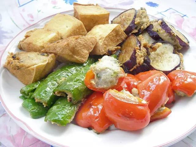 煎釀三寶是香港人對三種同類的常見街頭小吃的統稱。做法與肉釀豆腐類似,是把攪碎成肉泥的鯪魚肉釀在茄子、青椒和豆腐這三種食品中,然後放入油鍋裡煎,於是稱作『煎』『釀』『三寶』。