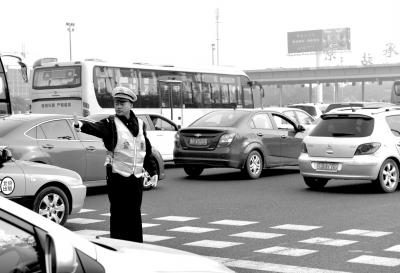 10月1日,京承高速收費站出京方向擁堵,交警在疏導交通。