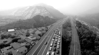 10月1日,八達嶺高速出京方向擁堵,與進京車道對比鮮明。