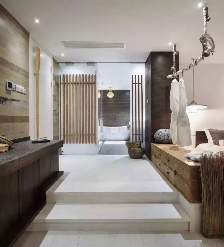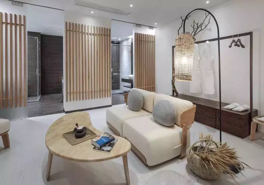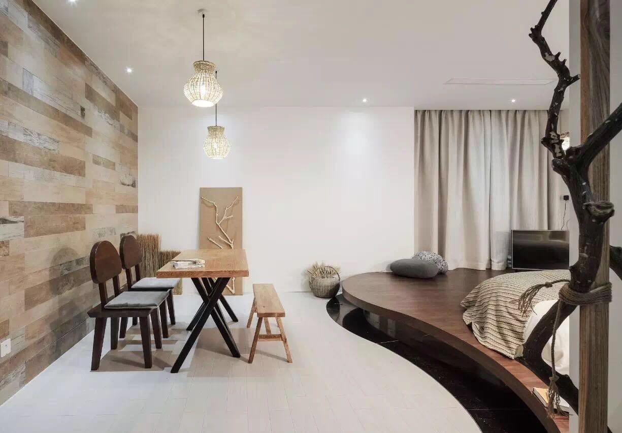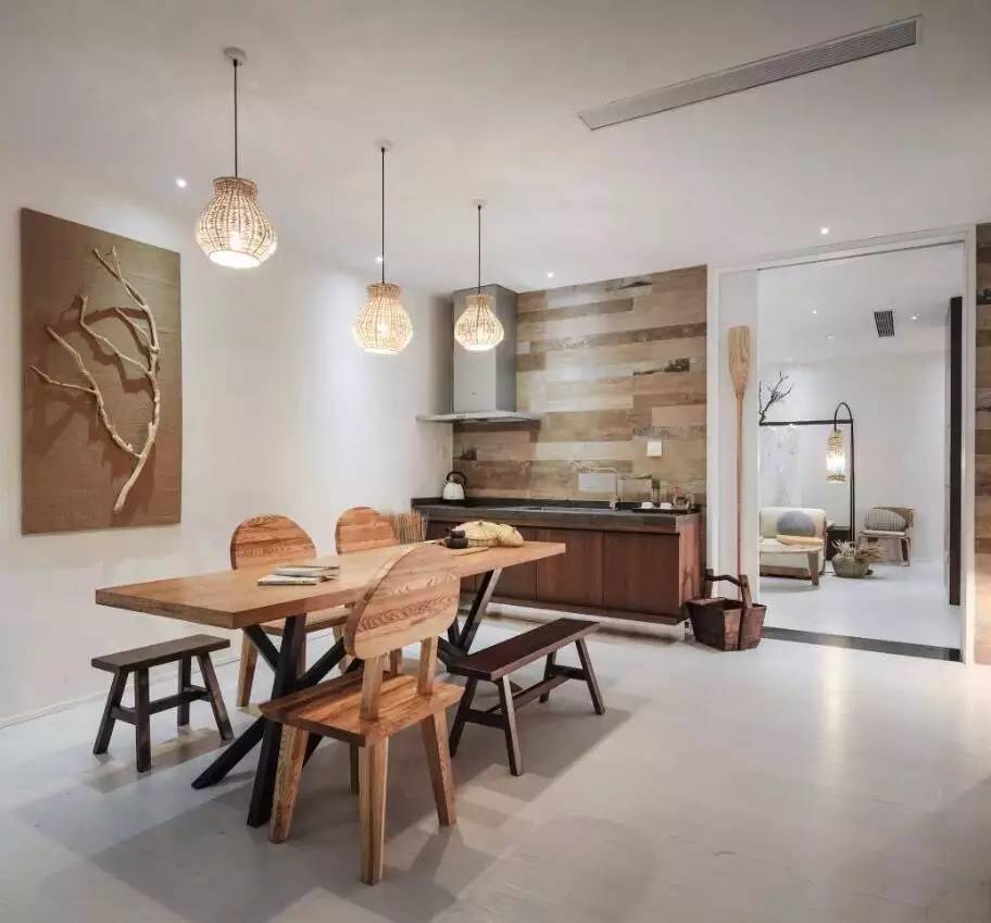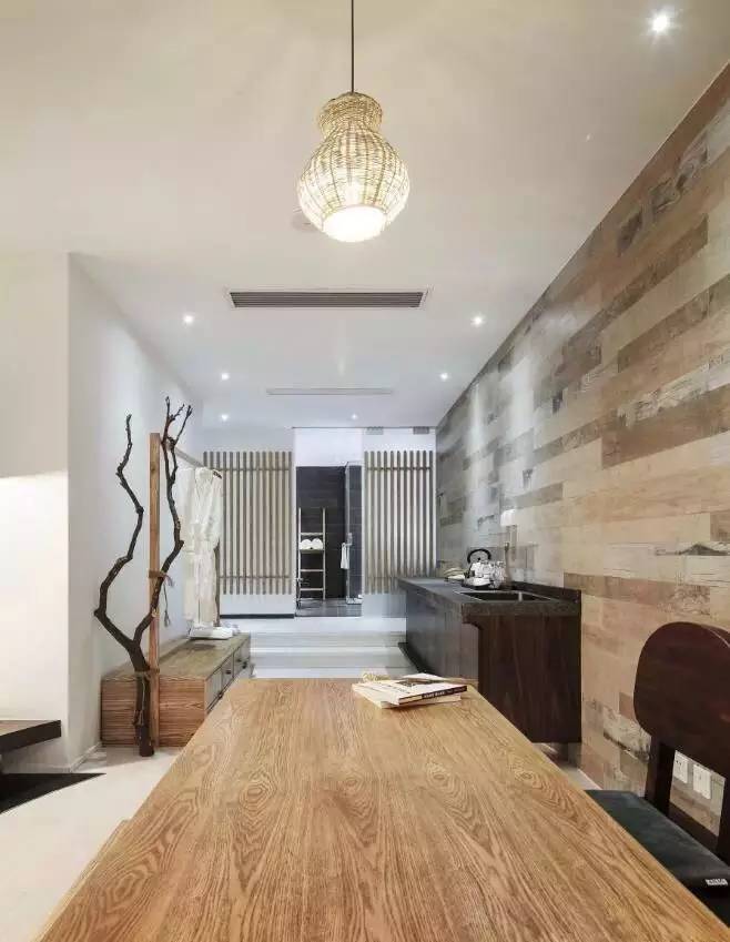 由各種材質拼接而成的牆面設計,不僅巧妙的將兩件內室自然分割,給人以抑揚頓挫的含蓄美感,而那自然古樸的牆面設計,不僅突顯的是自然的繁複和豐富,更是將一種顏色之間的過渡和配合一一表現,由深到淺的和諧顏色配比,由濃到淡的顏色自然過渡,仿佛是生長的森林一般,帶給人無窮的生機之感。