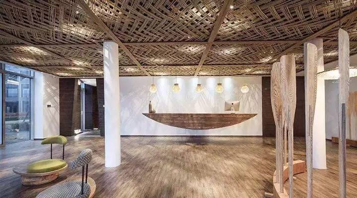 走在大堂,瞬間入眼的是設計師用實木雕琢出了兩葉舟,用支架的方式讓它漂浮在空氣中,好似水已經溢滿了大堂。