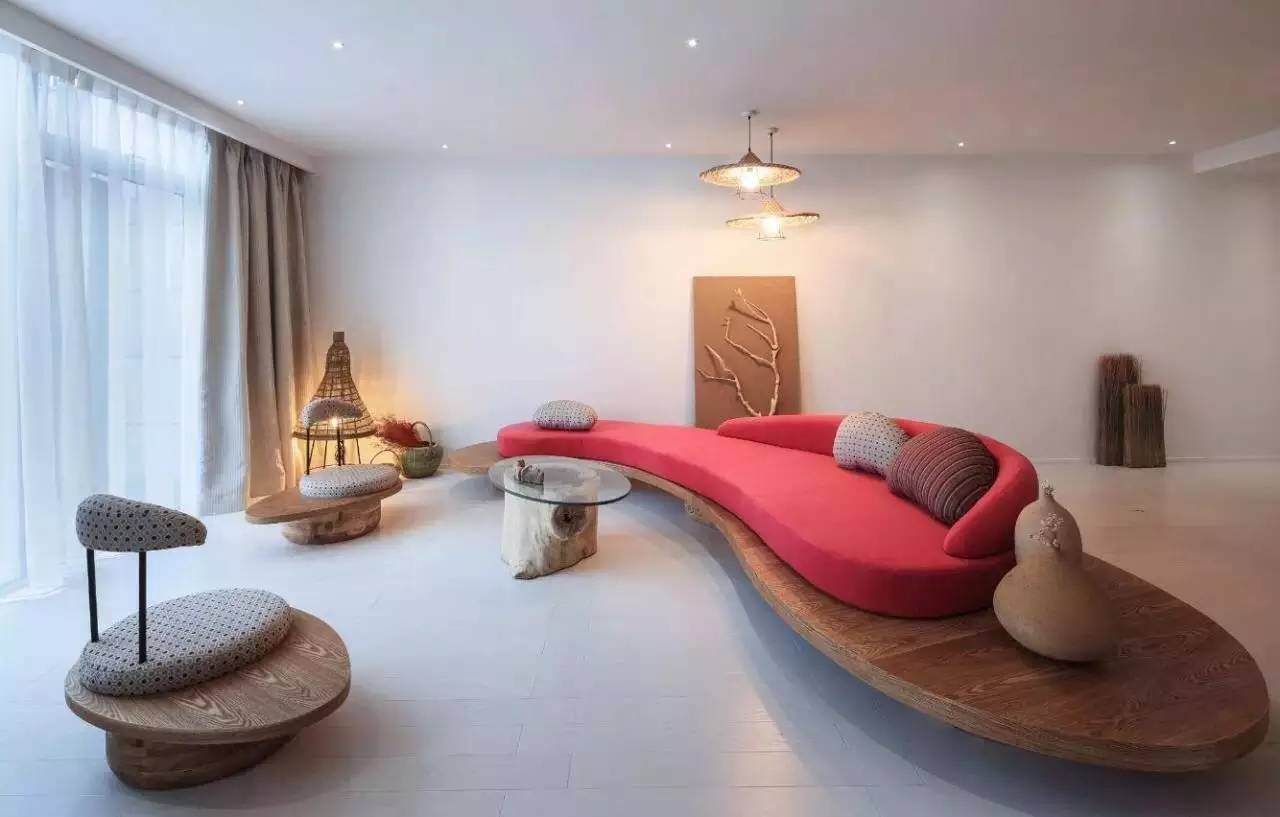 客房裡,以一顆石子觸碰水面那一剎那的波動作為沙發的形式,漣漪一般的撒出幾輪優雅的弧線,成就了空間裡的水的動與靜態。