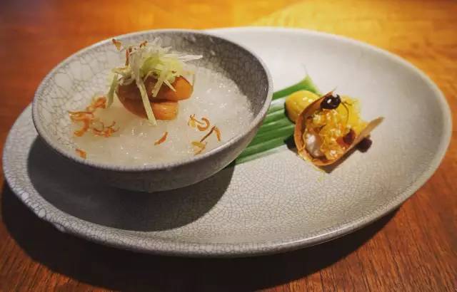 首先是一個簡單的Sorbet,好像是青檸和椰子,下面有些果汁和果凍。入口清涼甘甜,伴有些許刺激性的酸,在熱熱的曼谷街頭走了半天,這道冰冰涼涼的雪葩對舌頭來說是個不錯的開場。