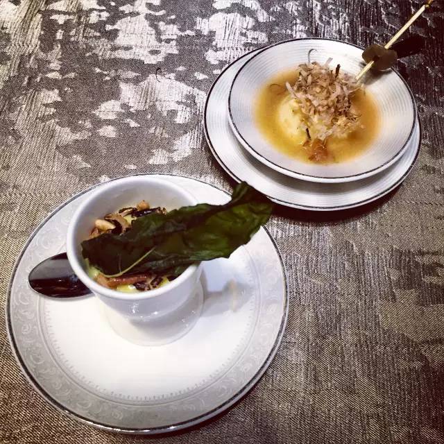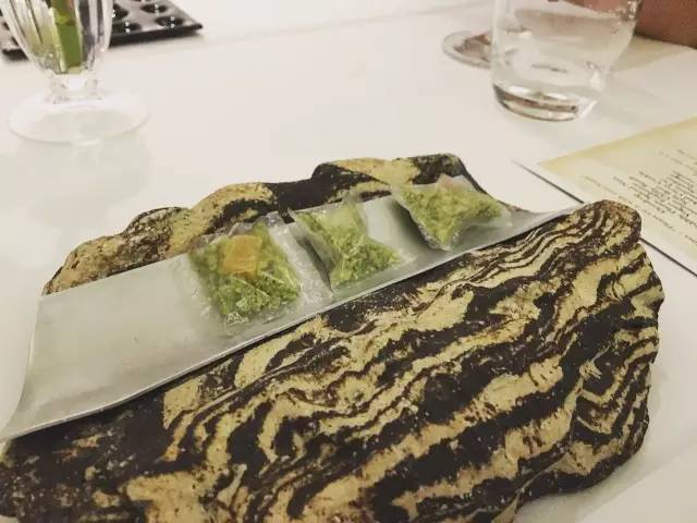 服務生也不說是什麼,讓我們靠舌頭來猜,這是一道完全調動各種感官的料理。我大概能吃出,黑色外殼是加了竹炭粉的木薯,白色碳灰是乾燥處理過的白洋蔥,但內層餡料完全沒有頭緒。