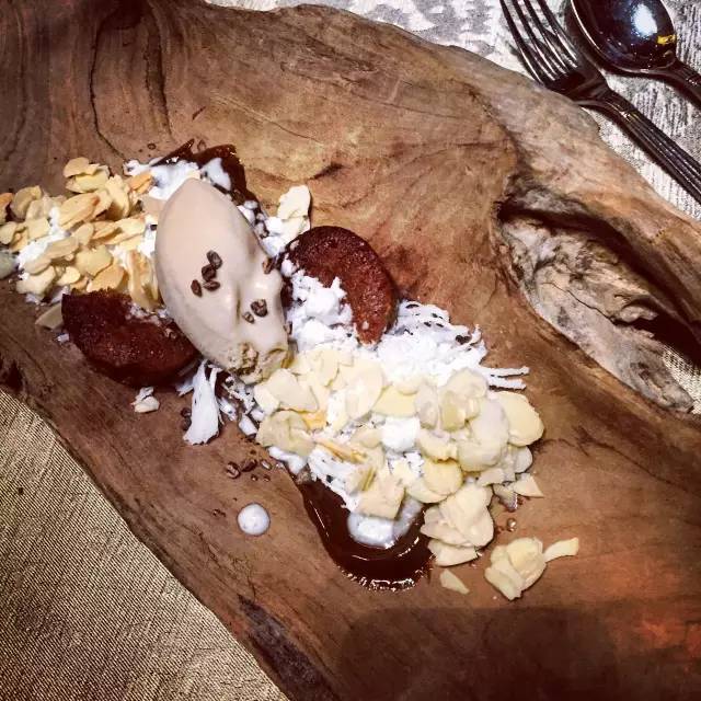 終於到甜點的部分了!這道菜在社交網路是出鏡率也非常高,服務員把一截樹皮直接搬上桌,裡面有撥碎的香蕉蛋糕和海鹽霜淇淋(前面吃了那麼多甜味的主菜,到了甜品居然又是鹹的了),焦糖牛奶繼續做成了粉末狀,配了些烤杏仁片,味道還是蠻不錯的,作為甜點來說不會很膩。