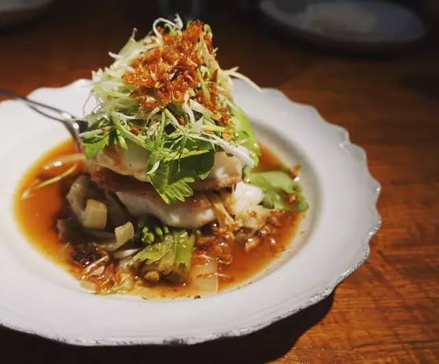 主菜蒸了一條七星斑,配了些炸蒜和黃豆,用叉子一切,魚肉就順著紋理斷開,火候掌握得不錯,但更勝在食材本身。