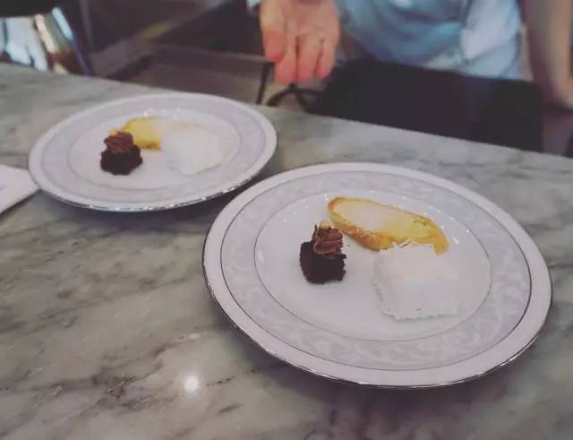 最後送上的三款餐後點心——一口迷你的巧克力黑森林,一口椰子棉花軟糖,一口芒果捲。我最喜歡椰子那一口。