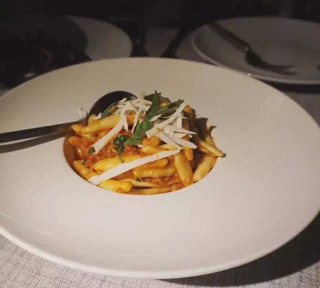 一份肉醬Pasta,這應該是最近吃到最好的一份Pasta!其實就是簡單的番茄肉醬,但這個麵做得太好,不同於許多餐廳用的乾麵,看這個形狀應該是新鮮做出來的Capunti或Trofie,薄薄一片自然捲,把醬汁都收裹在裡面,口感特別好。