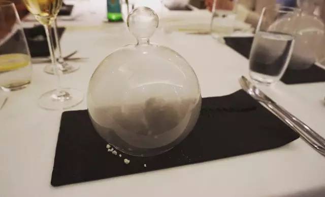 主菜,Gaggan的一道招牌菜——碳!揭開玻璃罩,聞到一股香木的煙燻味道,煙霧散開,眼前是一塊沾著炭灰的煤球。