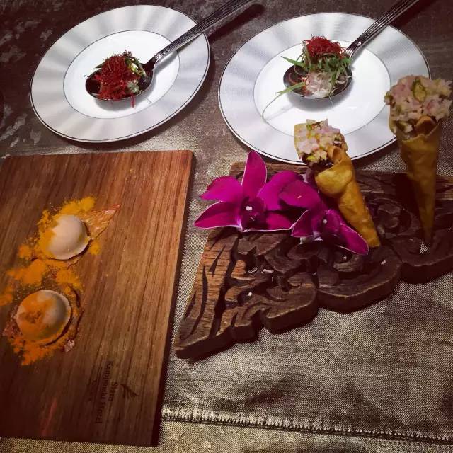 左下角橘色粉末是分子料理的標誌做法,口感類似費列羅,內含泰式酸辣醬汁。勺子的一口草,混了蝦肉粉絲+羅望子+檸檬草,三種絲狀物在嘴裡咀嚼出很衝的草本味道。右下角的泰式手捲,呈盤方式蠻特別的,味道也是辛辣路線。