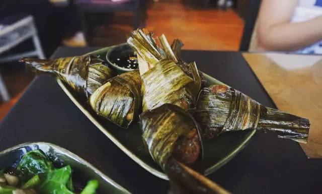Gai Hor Bai Toei,雞肉包括在香蘭葉裡一起炸,搭配羅望子醬,好吃。