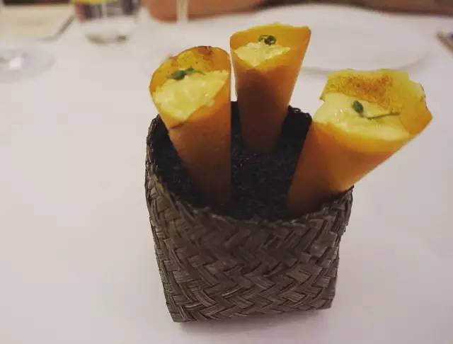 脆皮捲似乎是胡蘿蔔做成的,上層是芒果慕斯,下面是鵝肝醬,不知道和印度料理有什麼關係不過這一口非常好吃(畢竟是鵝肝啊)。