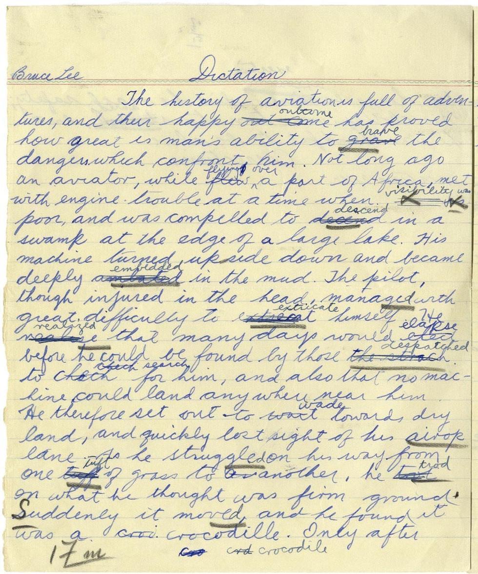 日前在美國洛杉磯,李小龍高中時期的一篇親筆英語聽寫作文將被拍賣,起拍價格5千美金。
