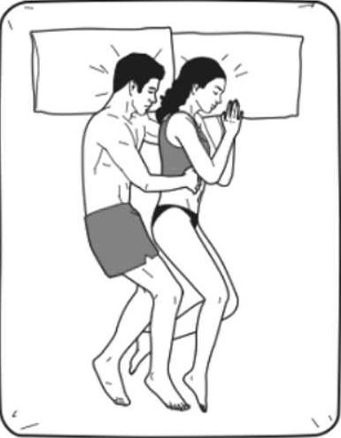 一方抱另一方入懷,緊緊依偎:這是身體上的無限貼近,顯示出情感的親密無間。『睡在後方的一人,在婚姻中往往扮演著保護者的角色;睡在前面的那個則是被照顧者,感情細膩、非常戀家。這種親密的睡姿還有一個好處,就是能增加性愛次數。』《睡姿的秘密語言》一書作者、美國行為學家意梵尼托馬斯說。