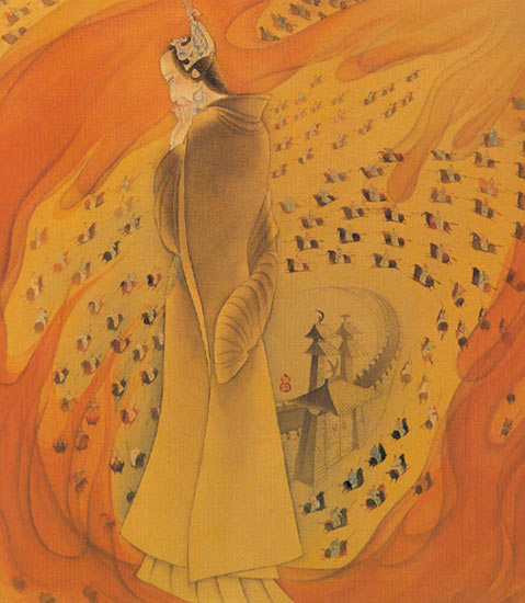 褒姒,也就是『烽火戲諸侯』中的那個從來不笑的美女。《東周列國志》把她的身世說得很神奇,但是實際上估計也就是『褒』部落的一個美少女,出於政治原因被獻給了周幽王,入宮後深得周幽王寵愛,但卻終日鬱鬱寡歡,周幽王便下令誰能使褒姒一笑,賞千金。後來奸臣虢國石父獻出『烽火戲諸侯』的餿主意,點燃烽火諸侯見到以為敵人進攻便發兵救援,來了以後才發現並無一敵,褒姒不覺啟唇而笑。周幽王從此失信於諸侯。