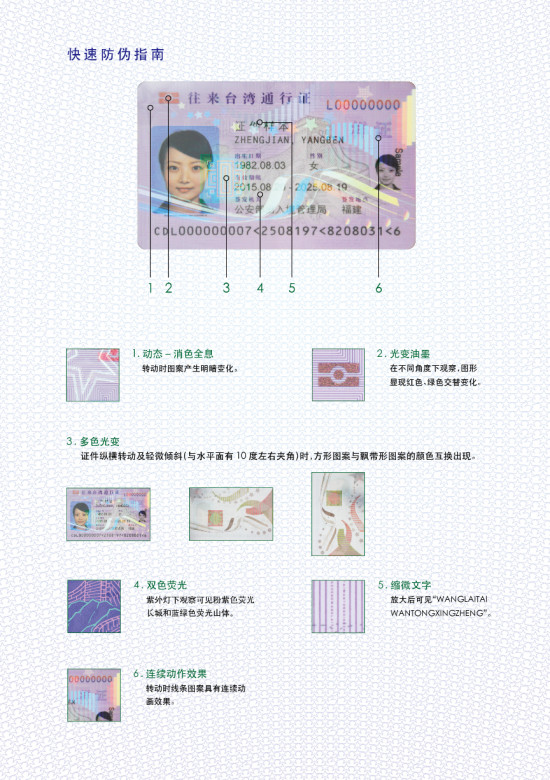 一、新版通行證為參照國際民航組織(ICAO)DOC9303 TD-1)標準設計製作的卡式證件,內嵌非接觸式積體電路晶片,採用多項物理防偽和數字安全技術。正面列印持證人個人資料以及證件簽發管理資訊,背面列印前往台灣簽注等資訊並可由證件簽發機關重複擦寫。新版通行證不再附發貼紙式簽注。