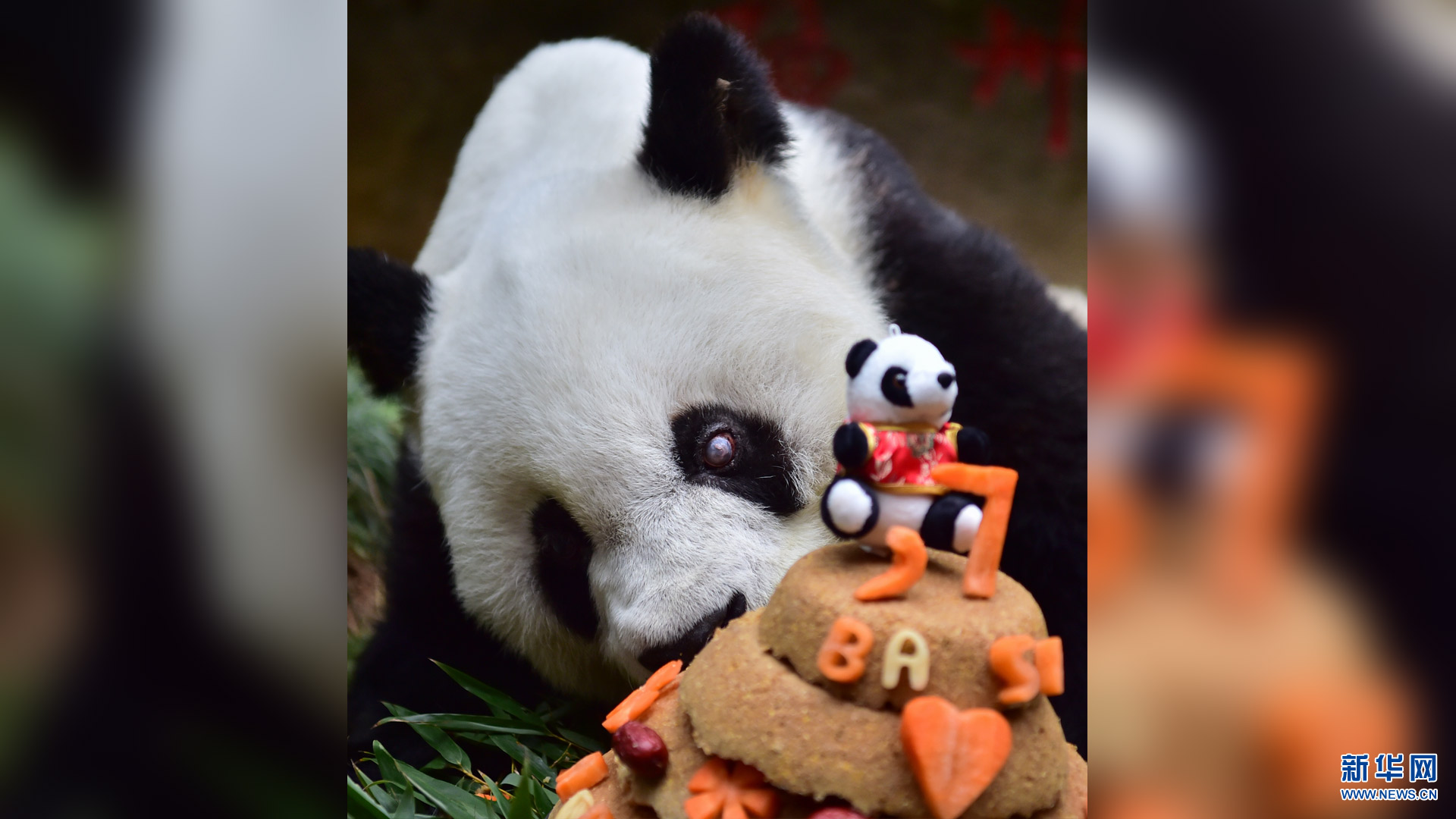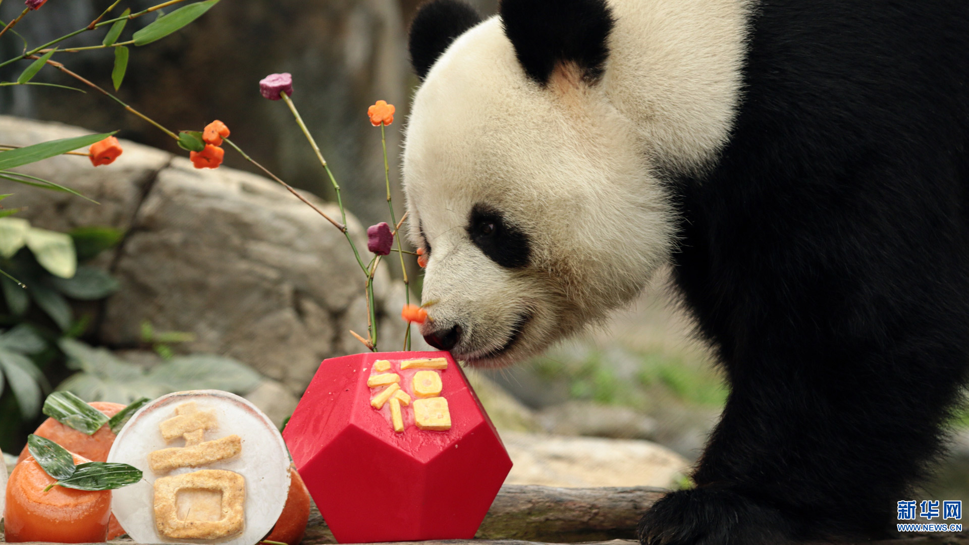 1月17日,大熊貓『巴斯』在品嘗為牠特製的蛋糕。