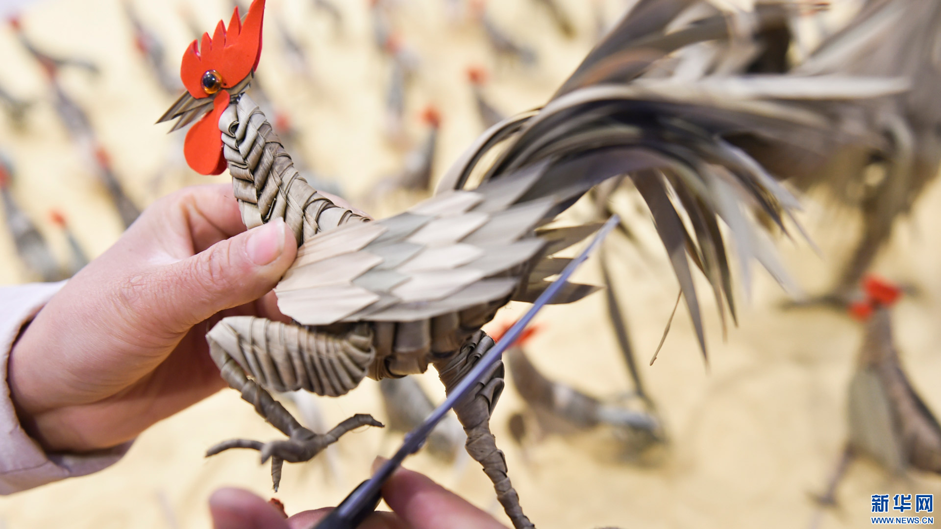 為迎接雞年到來,河南洛陽棕編藝人賈淑娟歷時一個月創作出近百隻活靈活現的『金雞』棕編作品,製作工序包括棕櫚葉的選材、薰蒸、陰晾、編製、組合、黏貼等。