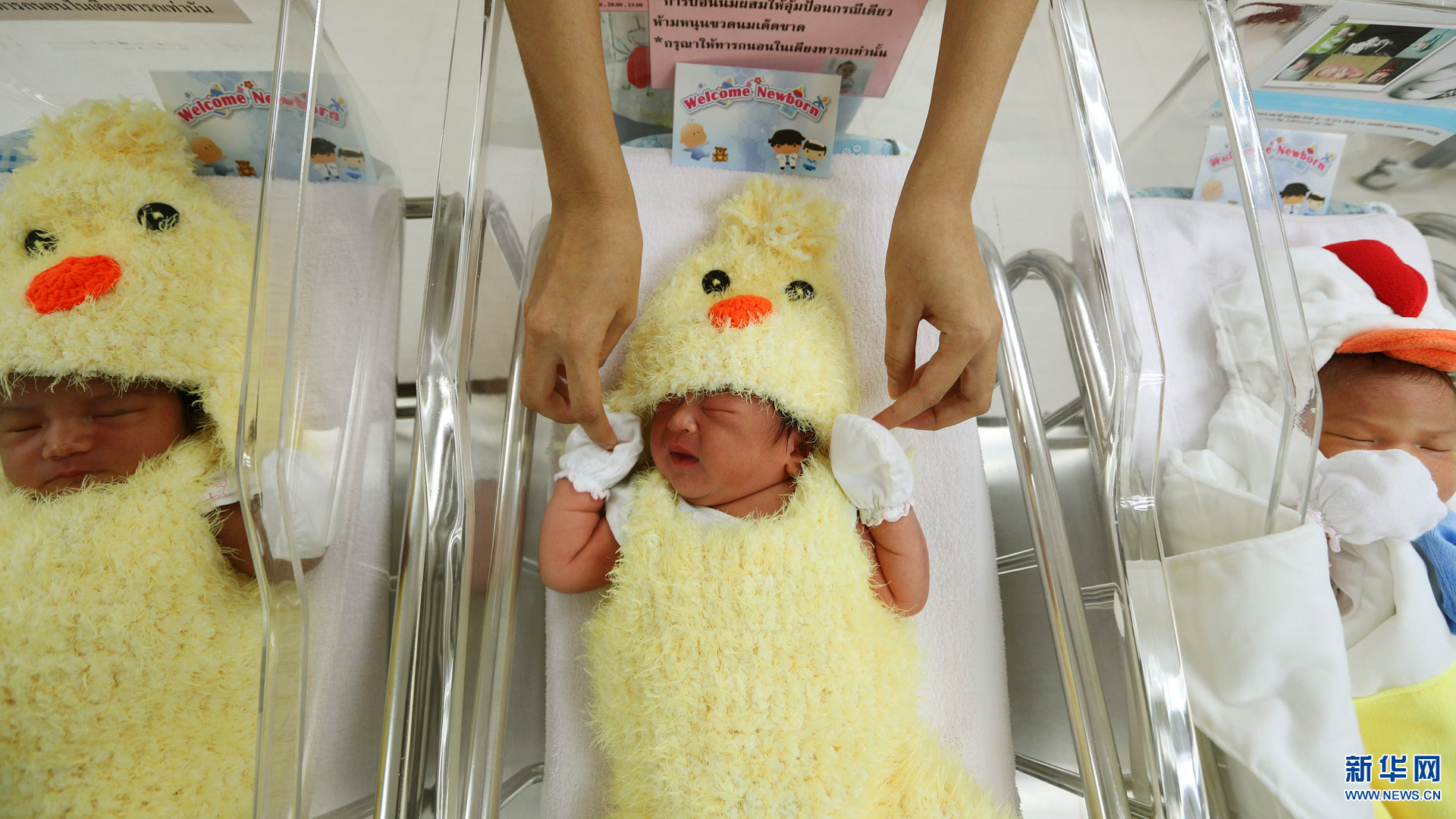 1月3日,在泰國曼谷,護士正在照顧身著小雞服裝的嬰兒。