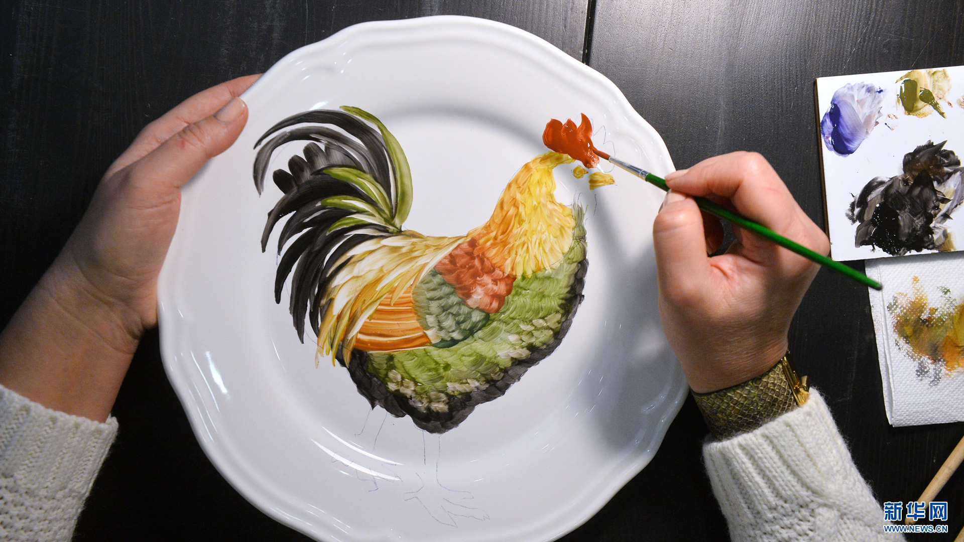 2016年12月17日,俄羅斯工藝美術師弗廖拉·達米諾娃正在其喀山市的工作室為瓷盤手繪生肖雞琺琅釉彩圖案。