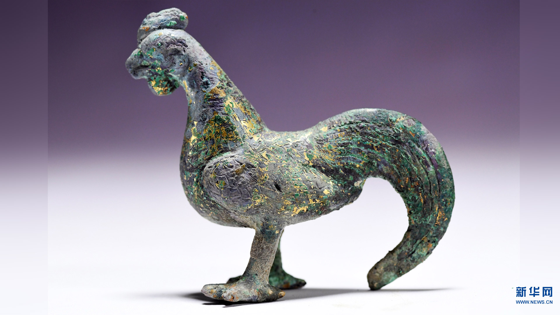 這是1月11日在宜城市博物館拍攝的修復完成的漢代鎏金銅雞。