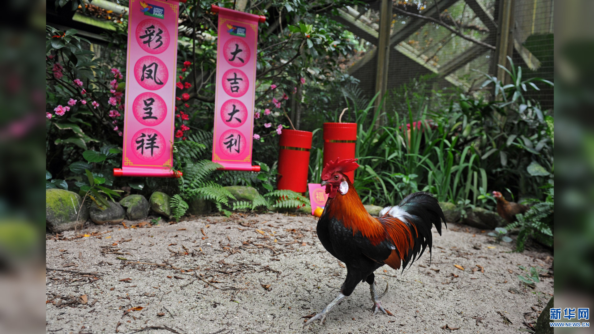 1月11日,一隻原雞在新加坡裕廊飛禽公園的農曆新年裝飾旁。 當日,新加坡裕廊飛禽公園推出『雞禽足跡展』,迎接農曆新年。