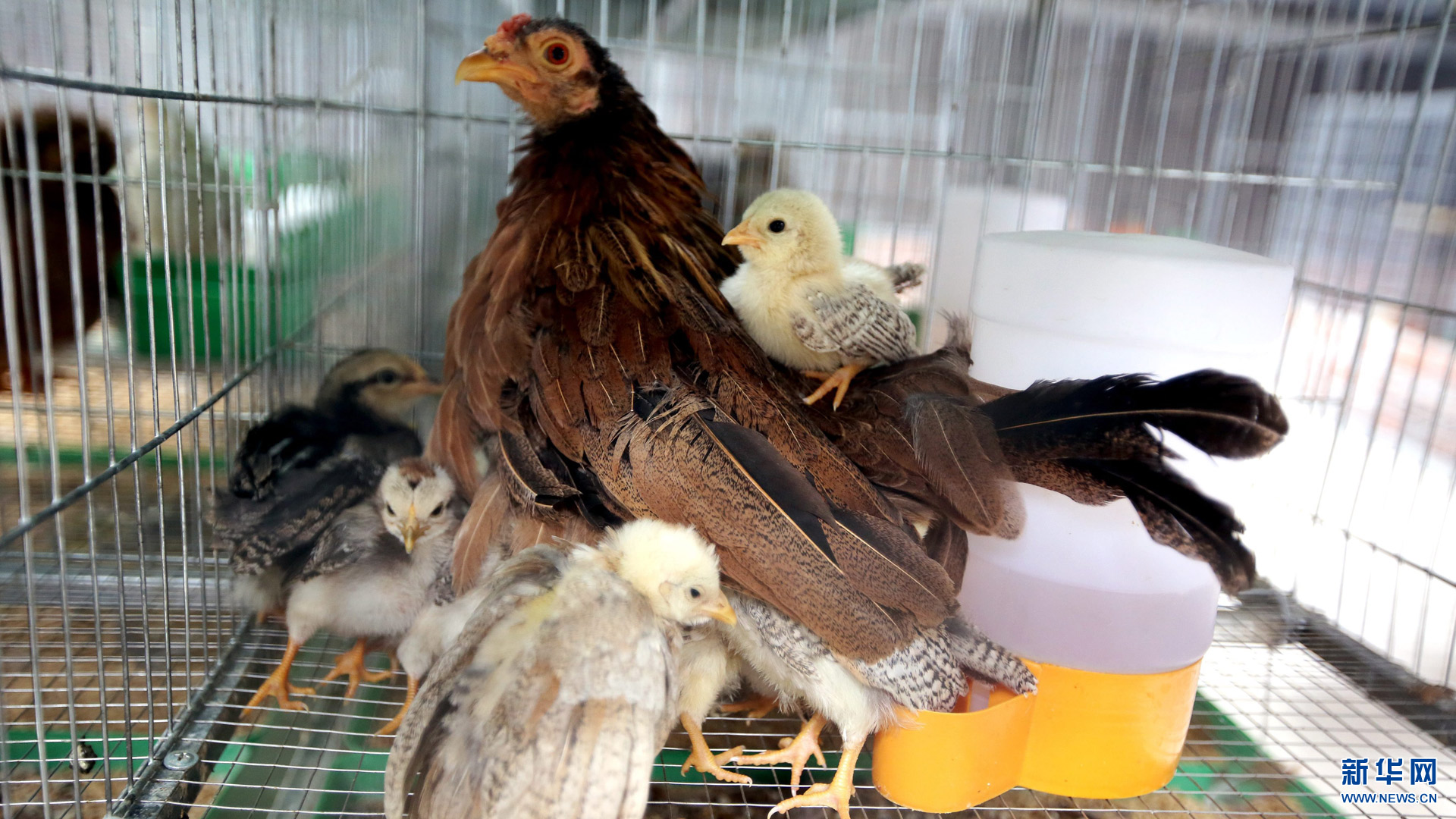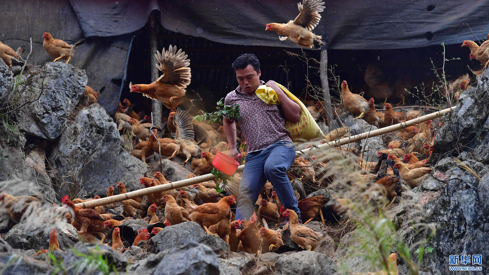 在廣西大化瑤族自治縣七百弄鄉弄雄村,貧困戶藍旺明在雞舍裡準備給七百弄雞餵食玉米。七百弄雞養殖是大化縣重要的脫貧產業(1月6日攝)。