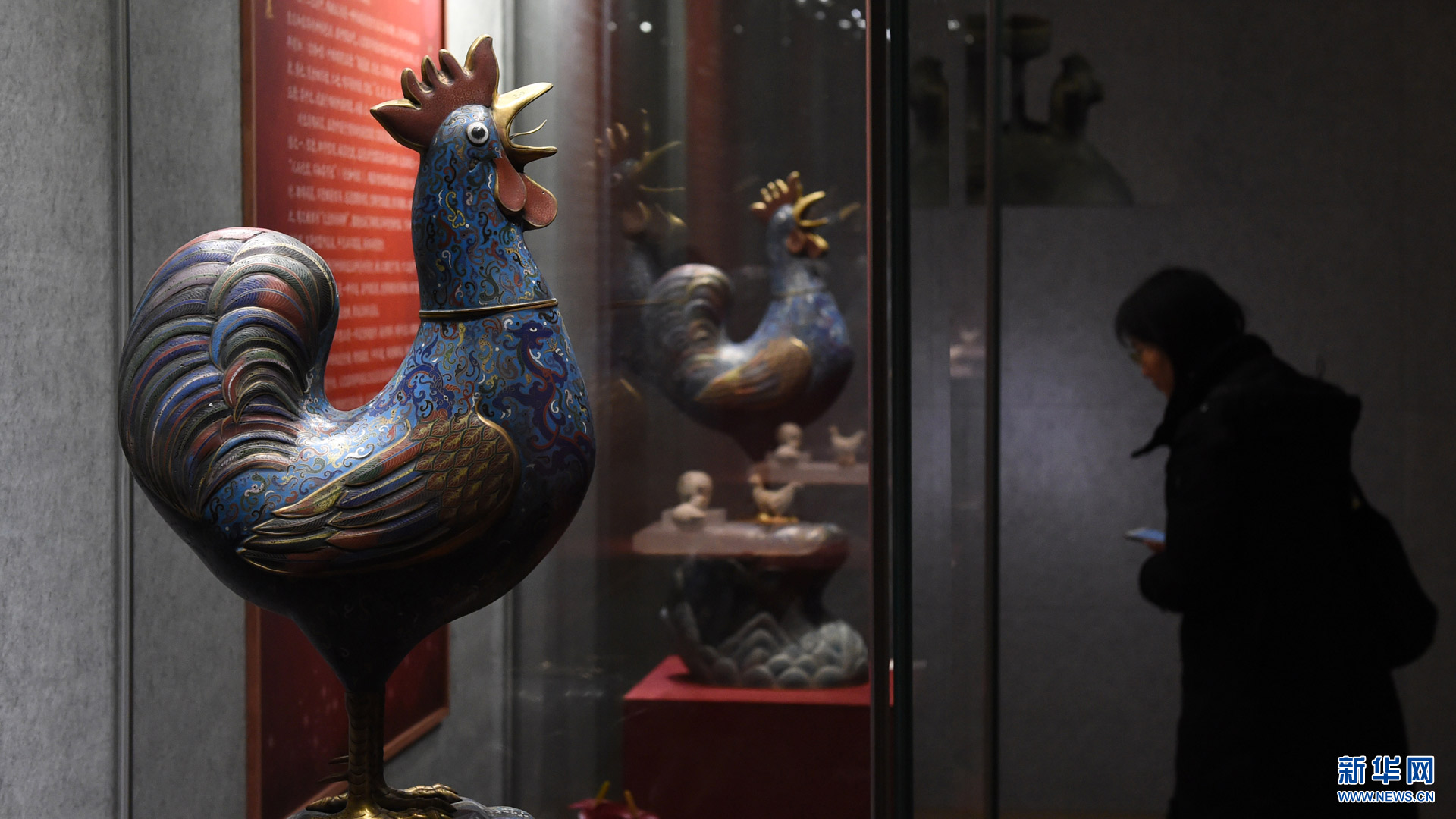 1月5日,觀眾在參觀一對民國時期的景泰藍雄雞銅擺設。