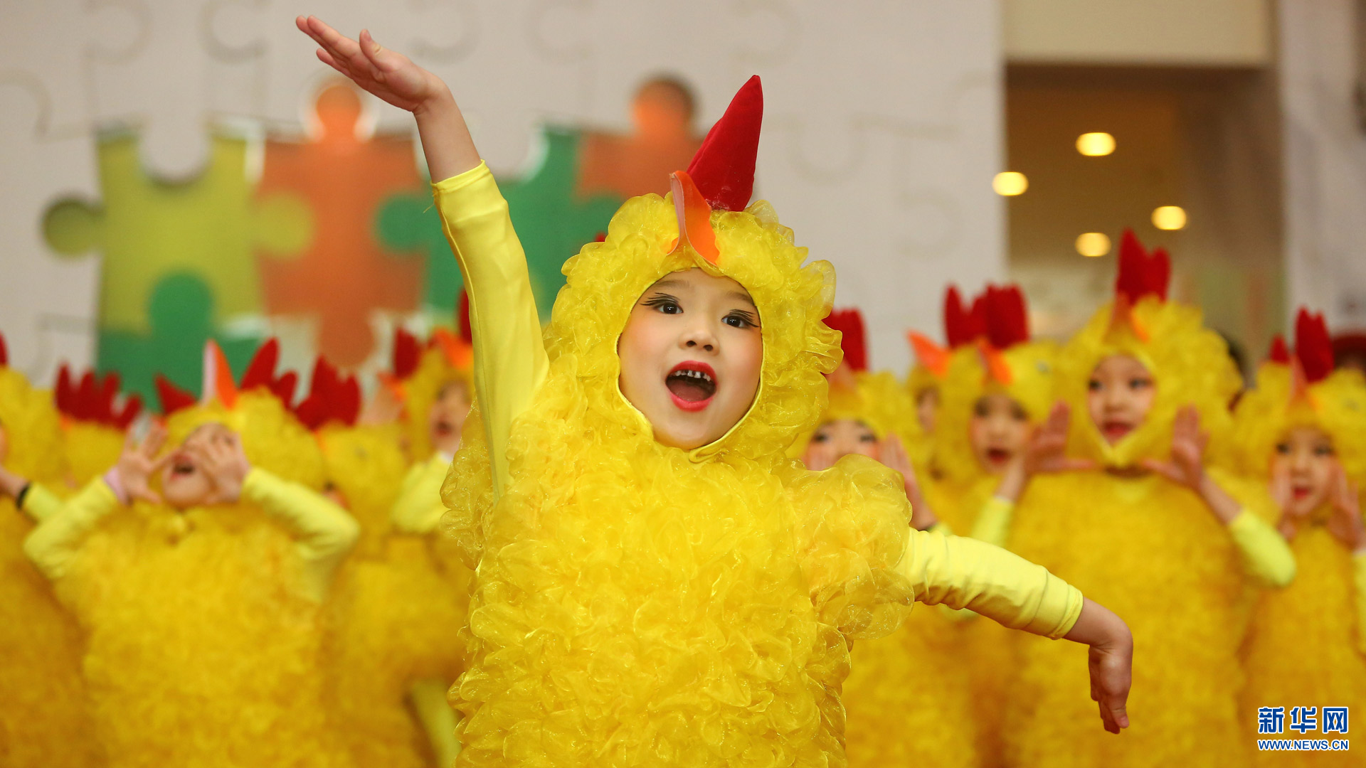 1月7日,小朋友裝扮成小雞的模樣表演開場舞蹈。