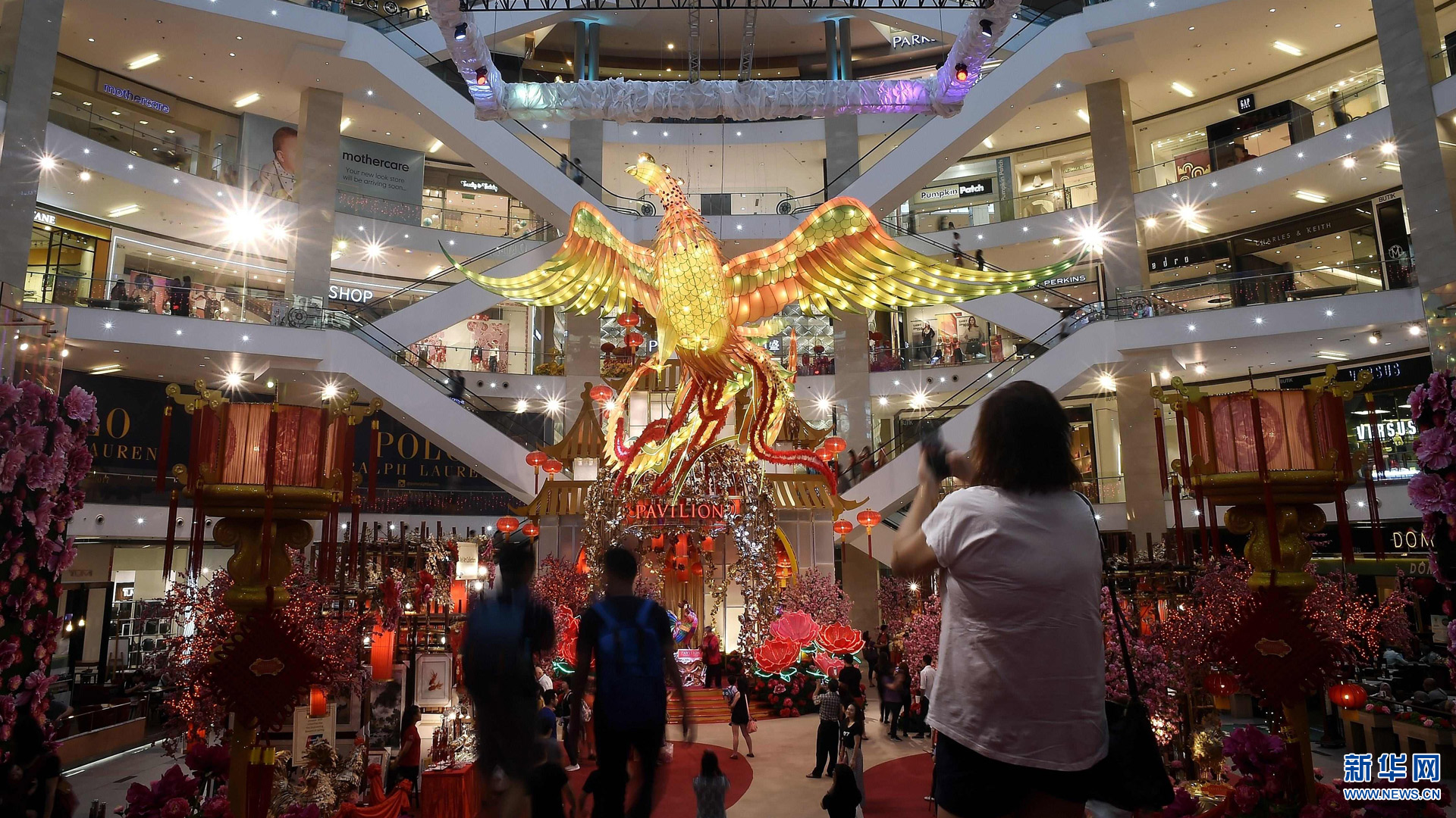 1月11日,在馬來西亞吉隆坡,顧客經過一家購物中心內公雞造型的燈光裝置。