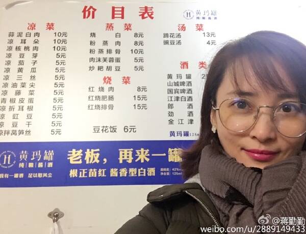 但平時蔣勤勤的微博除了宣傳都很接地氣,在家鄉重慶街頭吃蒼蠅館子。