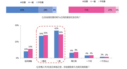 面對各種紀念日女性總是比男性更在意,清楚的記得紀念日的日期。但是,在準備禮物上卻沒有男性更用心。資料顯示,多數男性會提前一周開始準備,占比42%明顯高於女性。而女性提前一兩天準備的比例則高於男性,占比35%。節日更像是男朋友或老公買禮物證明愛意的時候,是女朋友或老婆檢驗真心的時刻,每到節日,微博微信朋友圈慢慢的全是曬鮮花、曬禮物、曬紅包、秀恩愛的。隨著戀愛經驗越來越豐富也更加懂得如何挑選禮物,禮物價格也更高。80後男性與85後女性在給對方送禮物時最肯花錢,分別為1233元和970元(以人民幣計算,以下同)。總體來看,男性在給女友送禮的花費略高於女性。無論是在節日的準備上還是成本上,男性的態度都略勝一籌。