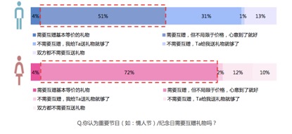 資料顯示,半數男性與七成女性表示,重要日子裡需要互贈有心意的禮物即可,不看重禮物的價格。而三成的男性很氣度的認為只要自己給女友送就夠了。在情人節、紀念日時,除了送禮物,過節的形式也越來越多種多樣。調研顯示,男性最願意和女友一起在家自家做飯慶祝,女性則更願意出去外面吃大餐慶祝,還有23女性選擇外出旅遊,可見節日形式已經越來越多元化。