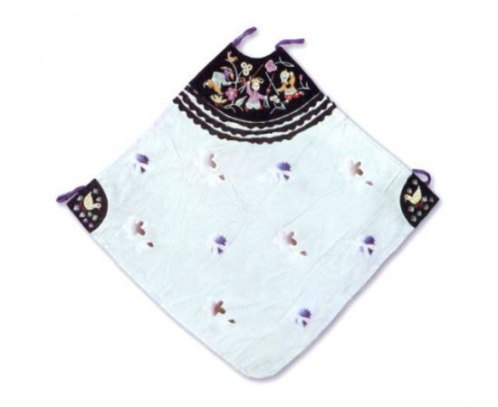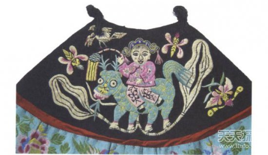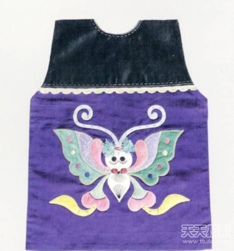 此肚兜為方形,上半黑地,下半部分紫地上貼繡彩蝶紋,圖案精美,做工細緻,是清代的傳世珍寶。